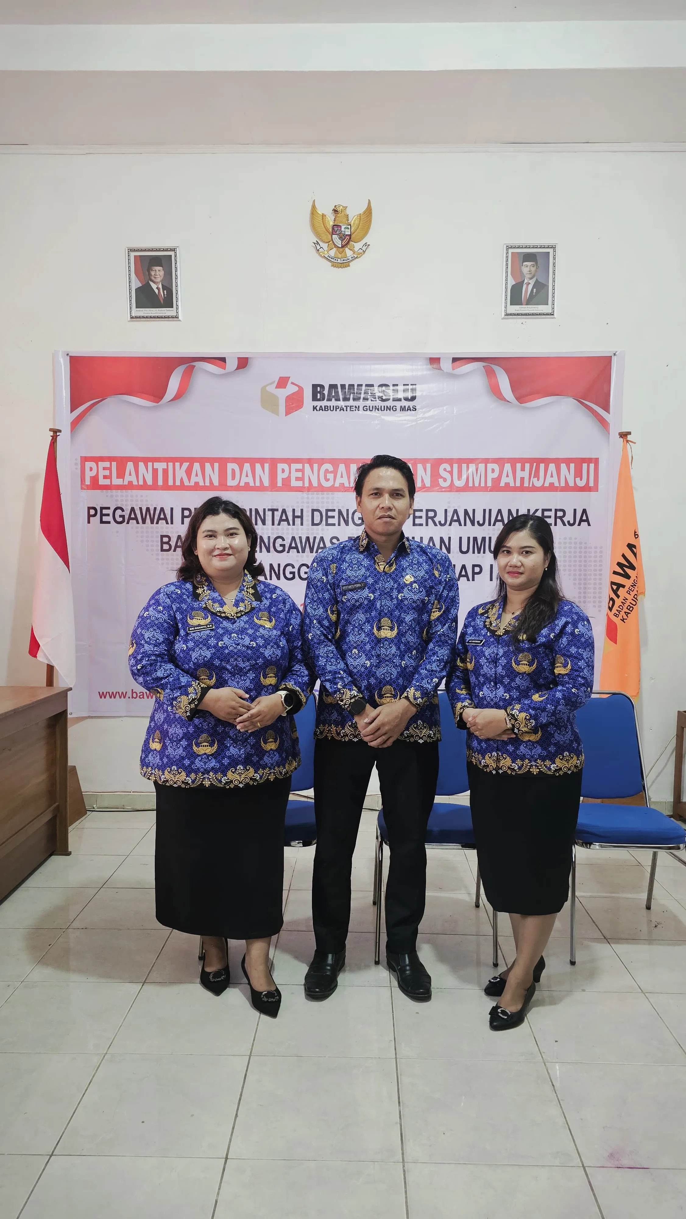 Sebanyak tiga orang Aparatur Sipil Negara (ASN) Pegewai Pemerintah Dengan Perjanjian Kerja (PPPK) di Lingkungan Badan Pengawas Pemilihan Umum (Bawaslu) Kabupaten Gunung Mas dilantik oleh Sekretaris Jenderal Badan Pengawas Pemilihan Umum Republik Indonesia